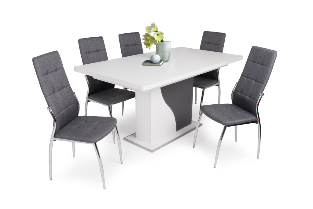 A Boris - Alíz  étkezőgarnitúra 6 személyes. Tartalmazza a 6 db Boris széket  és az Alíz asztalt. Az asztalt lapra szerelve, csomagban, a székek összeszerelést igényelnek. A képen látható 6 személye asztal mérete: 160*90 cm +40 cm vendéglap