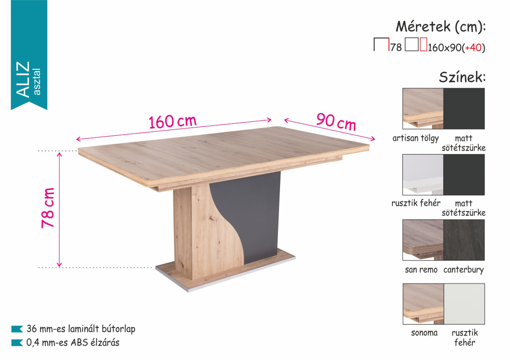 Aliz asztal termékünk 160 cm-es méretben, bővíthető vendéglappal kapható. A vendéglapot behelyezve a lábbal megegyező színkombinációt kapunk. 4 színkom bináció közül választhatunk: artisan tölgy – matt sötétszürke, rusztik fehér – matt sötétszürke, san remo – canterbury, sonoma – rusztik fehér.