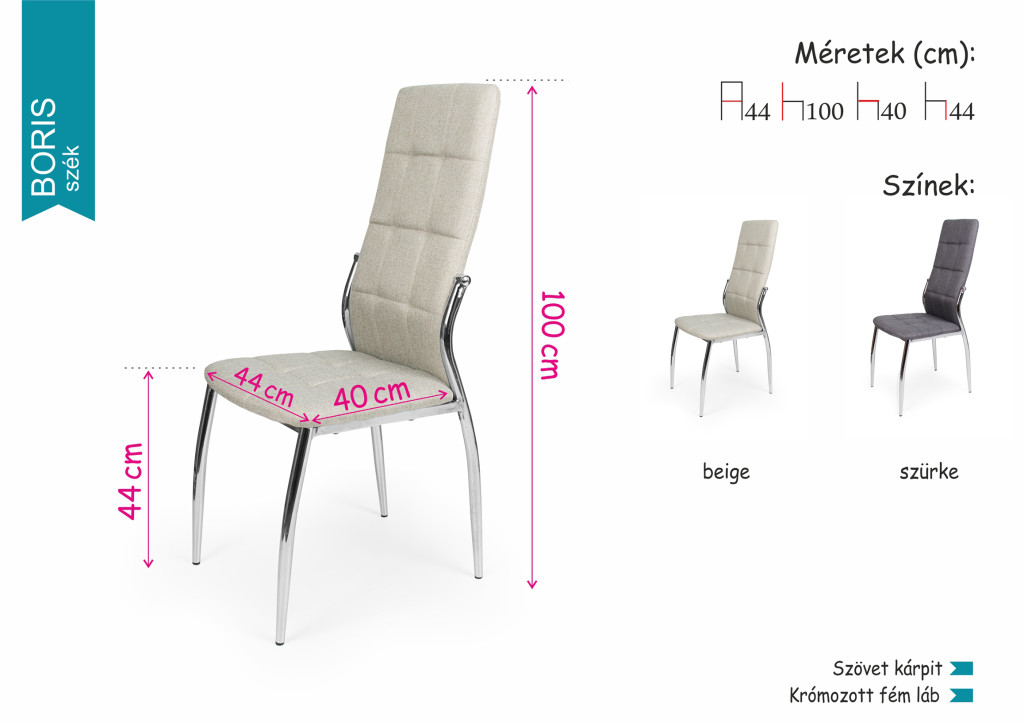 A Boris szék szövet kárpitjával és krómozott fém lábaival egyszerre biztosítja az elegáns megjelenést és a kényelmes étkezést. Az igényes tereket, a korszerű megoldásokat kedvelők számára egyaránt javasolt, korosztálytól függetlenül.