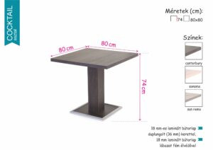 Ha minőségi, kis alapterületen elférő asztalon gondolkodik, akkor a Cocktail asztalunk lehet a tökéletes választás. Az asztallapok laminált bútorlapból készültek, duplungolt kerettel, a lábazat fém élvédővel ellátott. A letisztult formavilágú, 74 cm magasságú Cocktail asztal 80×80 cm-es asztallapjával a baráti beszélgetések ideális bútordarabja.