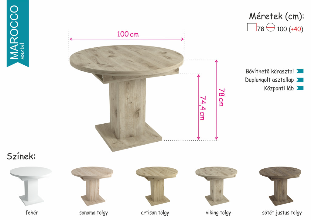Marocco asztalunk 100 cm-es méretben, bővíthető vendéglappal kapható. 5 színben vásárolható meg: fehér, sonoma tölgy, artisan tölgy, viking tölgy és sötét justus tölgy.