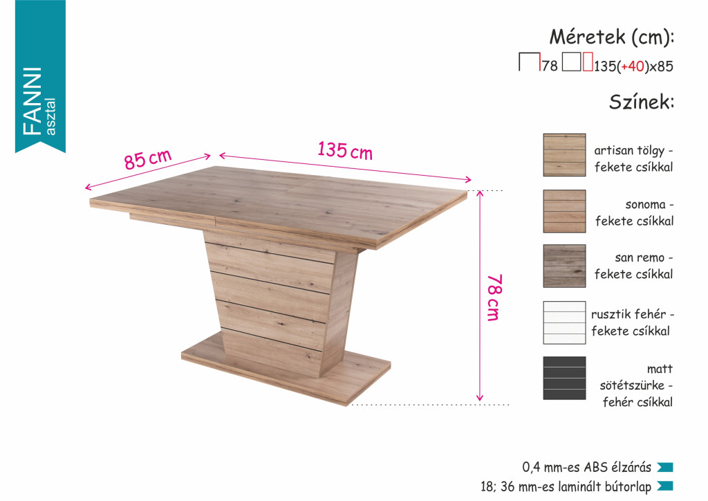 Ha trendi étkezőre vágyik, válassza új Fanni asztalunkat! Modern forma és szín, bővíthető asztallap. A Fanni asztal nemcsak mutatós, de praktikus is! Artisan tölgy, sonoma tölgy, san remo, rusztik fehér szín fekete csíkozással, matt sötétszürke szín fehér fehér csíkozással egészül ki a lábon.