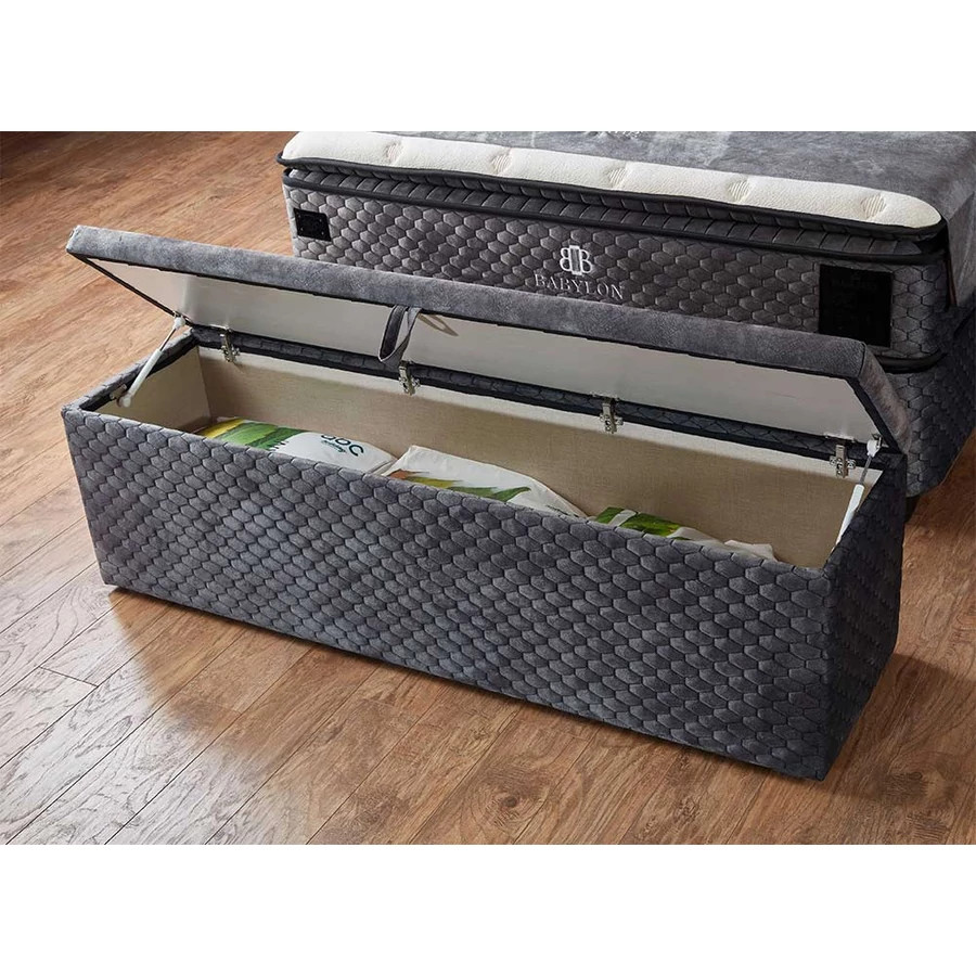 A Magnesia felnyitható, tárolós hálószoba pad ötvözi az eleganciát és a praktikusságot. Puha tapintású, bézs színű anyaggal kárpitozott, oldalán körbe "krokodilbőr"-t utánzó mintával. Alján 4 fekete, kerek láb található. A felnyitását gázrugó és fogantyú könnyíti meg. Pihenjen meg a padon, majd felnyitva tárolhat benne plédet, párnát ágyneműt!