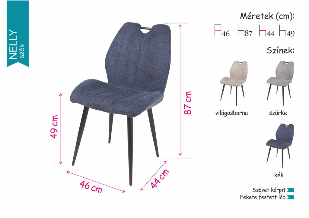 A Nelly szék szövet kárpittal és fekete festett lábakkal kitűnő kiegészítője a modern otthonoknak. Három színben érhető el: világosbarna, szürke és kék.