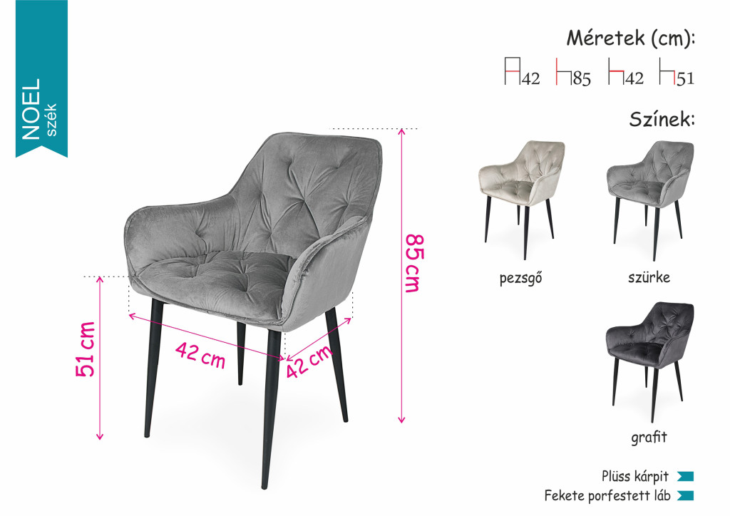 A Noel szék plüss kárpittal, és fekete porfestett fém lábakkal kitűnő kiegészítője a modern otthonoknak. Három színben érhető el: pezsgő, szürke és grafit.