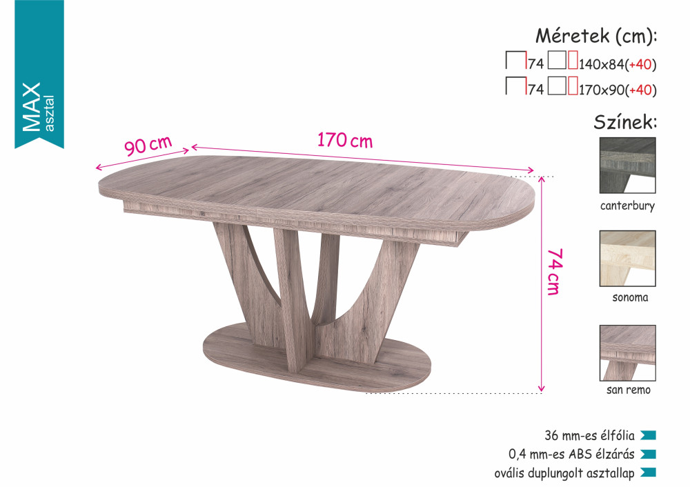 Ha az étkezőben központi szerepet szán asztalának, kitűnő választás lehet a Max asztal. A lekerekített formavilág és trendi megjelenés időtálló, stabil kialakítással társul. Méretét tekintve 140×84 cm és 170×90 cm-es változat érhető el, melyek sonoma, canterbury és san remo színekben kaphatóak. A Max asztalunkhoz vendéglap is tartozik, amely segítségével további 40 cm-rel bővíthető az asztal felülete.