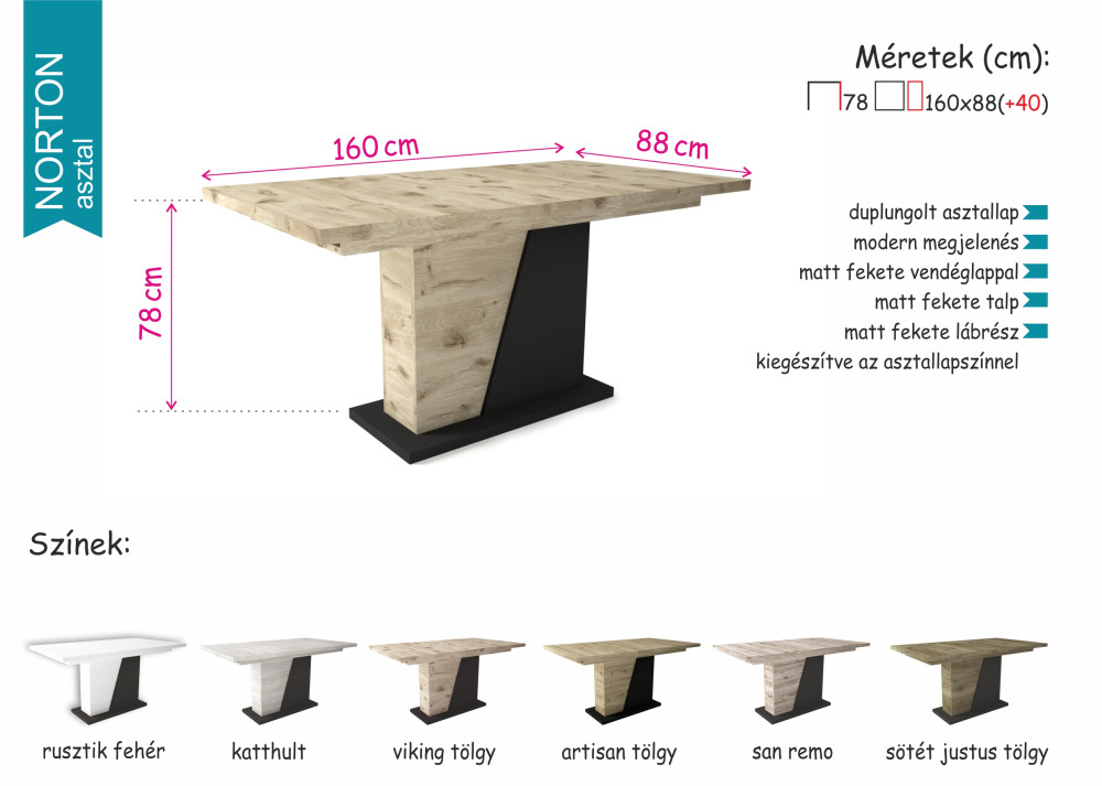 A Norton asztal 160 cm-es méretben, 6 színben kapható: rusztik fehér, katthult, viking tölgy, artisan tölgy, san remo és sötét justus tölgy. A talp matt fekete, matt fekete lábrész kiegészül az asztallapszínnel. Bővíthető 40 cm-es vendéglappal, amely szintén matt fekete, így a vendéglapot behelyezve a lábbal megegyező színkombinációt kapunk.