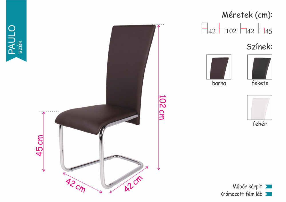 A Paulo szék maximálisan illeszkedik a modern lakberendezési irányzathoz, mely korosztálytól függetlenül remek választás. Krómozott fém lábak és műbőr kárpit jellemzi. A Paulo szék kényelmes kialakításával és stílusos megjelenésével varázsolja otthonát korszerűvé és igényessé.