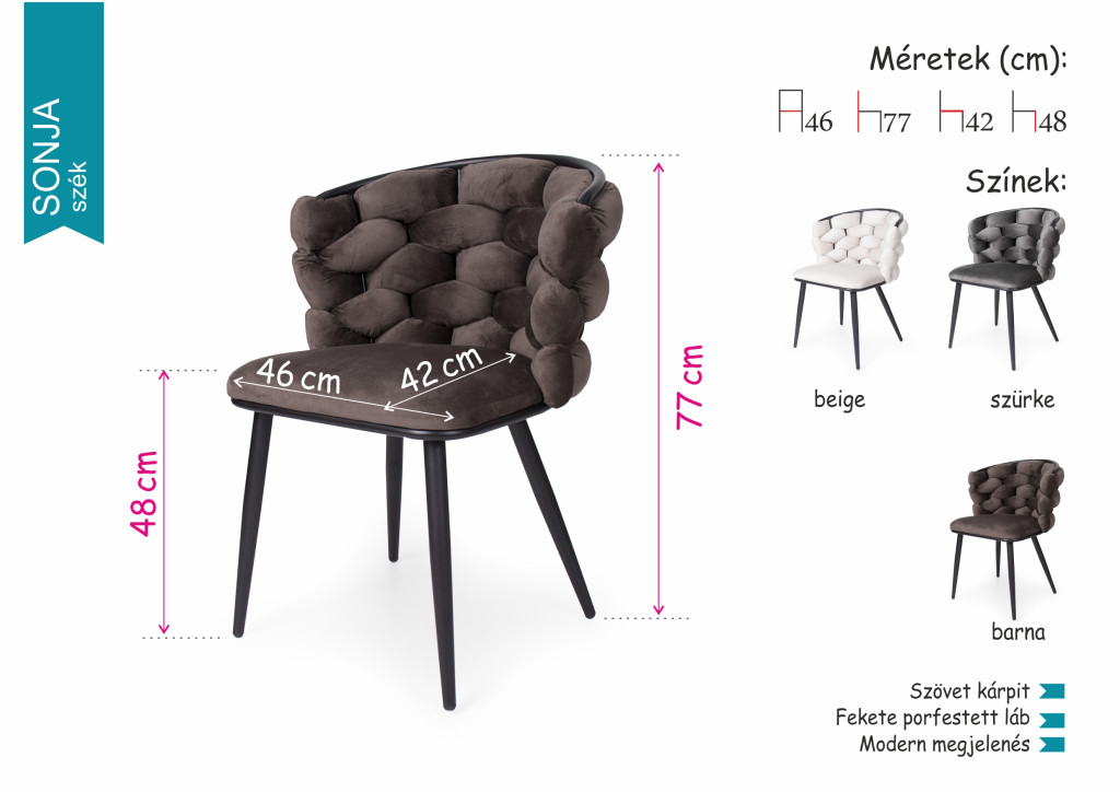 A Sonja széket szövet kárpit, fekete porfestett láb jellemzi. Három színben érhető el: beige, barna és szürke.
