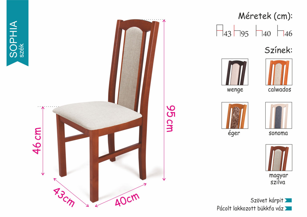 A természetes megoldások kedvelői számára remek választás a Sophia szék. A szövet kárpit és a pácolt lakkozott bükkfa váz kiválóan passzol a legtöbb lakberendezési irányzathoz. A konyhába és az étkezőbe ideális bútordarabok időtálló minőségükkel járulnak hozzá a kényelmes és egyúttal stílusos berendezéshez. 5 szín közül lehet választani: calwados, wenge, sonoma, magyar szilva és éger.