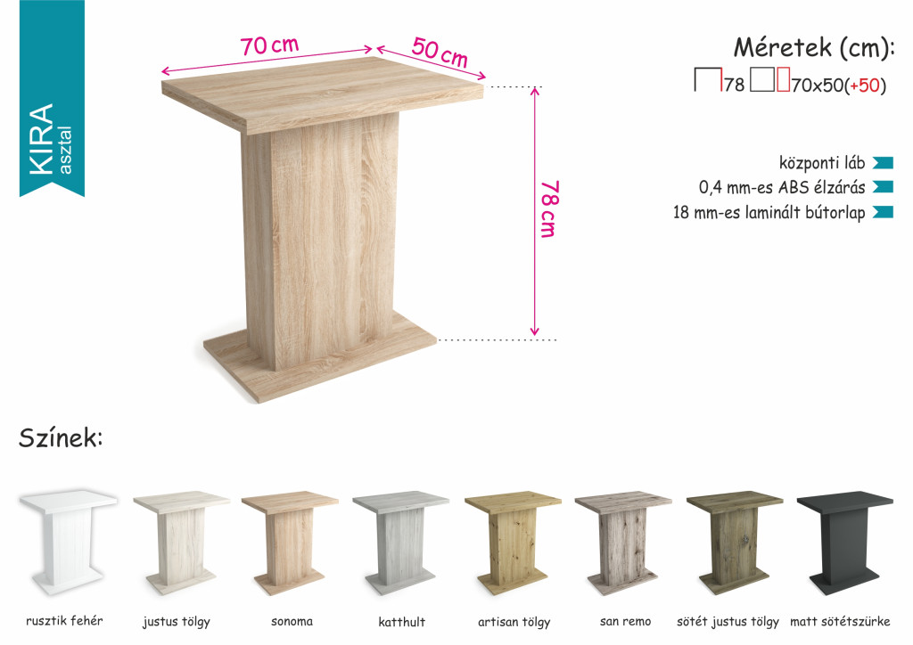 Laminált bútorlapból készült Kira asztalunk 70 cm-es méretben, bővíthető vendéglappal kapható. 8 színben vásárolható meg: rusztik fehér, justus tölgy, sonoma, katthult, artisan tölgy, san remo, sötét justus tölgy, matt sötétszürke.