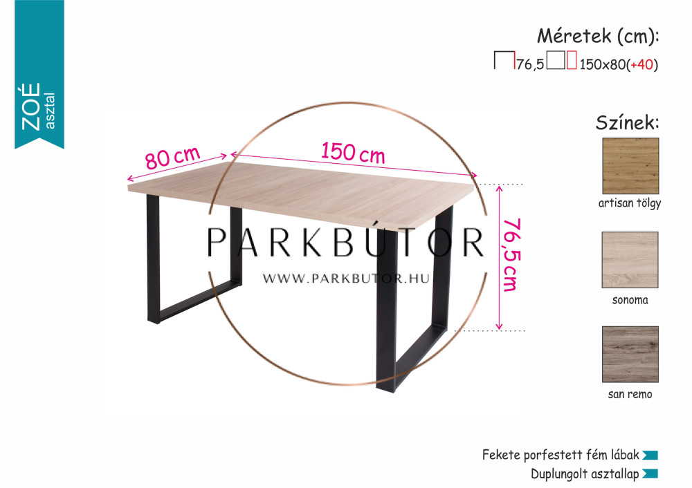 Zoé asztal modern megjelenésű, fekete porfestett fém lábakkal, duplungolt asztallappal.